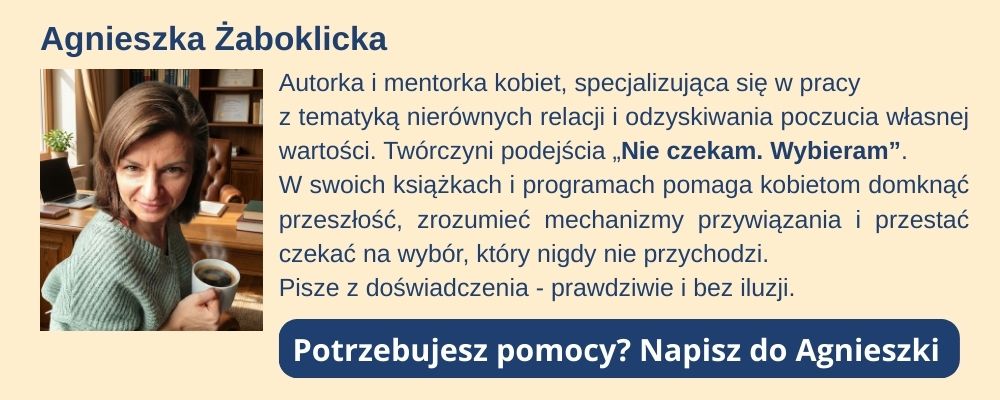 Agnieszka pisze z miejsca doświadczenia, dlatego każde zdanie trafia w punkt i zostaje pod skórą.To lektura, która nie głaszcze – ona budzi i przywraca godność tam, gdzie była nadzieja bez decyzji. Jeśli masz dość bycia „prawie”, ta książka może być początkiem Twojego powrotu do siebie.